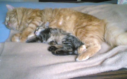 O göbüşündeki, çocuklarından biri aslında: kızı  KOFİ; hala bizimle de yaşıyor ve tüy ile iskelet yapısı babasına benziyor. Umarım sağlığı benzemez ileride. Bu apartmana taşındığımızda, bir gün acıklı miyavlamalar duyduk ve aşağı indik. Giriş katı balkonundaydı. Aldık, doyurduk, inanılmaz piresi vardı tedavi ettik. Ama bizim canavar kedilerimiz hep dövdü onu, o yüzden genelde benim yatak odamda yaşadı, yaşlandı. O kadar güzeldi ve o kadar iyi huyluydu ki, kimselere veremedik. Ne atlar, ne zıplar, ne karıştırır, ne kavga eder. Sevilmeye, kolumuzda uyumaya bayılır. Bir kez çiftleşti ve 4 yavrusu oldu. Hiç biri huy ve şekil olarak ona benzemedi ne yazık ki. 9 yıldır oğlusumuz işte Barbo.
